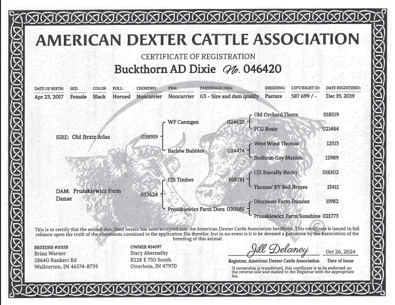 buckthorn ad Dixie Apr 23 Written By Riley Abernathy Date of Birth: 04/23/2017Sex: FemaleColor: BlackPoll: HornedSire: Old Bratz AtlasMare: Prusakiewcz Farm Danae Riley Abernathy